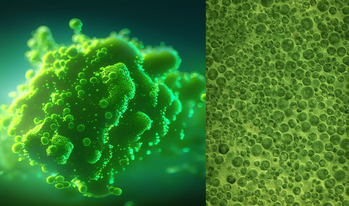 Хлорелла в представлении нейросети и реальная фотография. Промт: Хлорелла. Одноклеточная водоросль. Микроорганизм. Стиль 3D рендер.