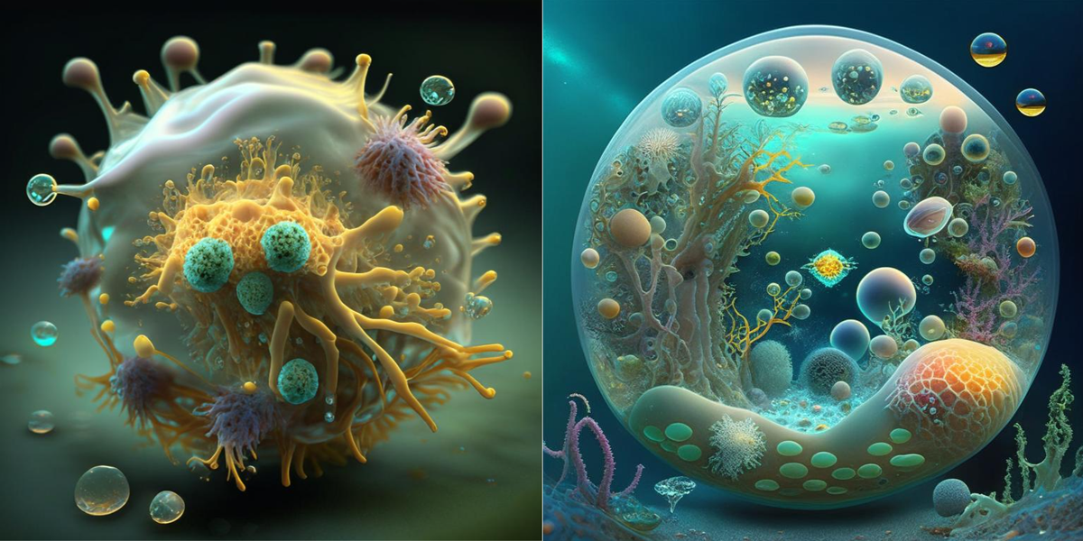 Изображение, полученное от нейросети выглядит вполне реалистичным и не содержит грубых биологических ошибок. Можно условно принять большой пузырёк внутри клетки за ядро, а остальные за органоиды и вакуоли. Внутри цитоплазмы даже можно увидеть частицы различных включений, так бывает и в реальной жизни.