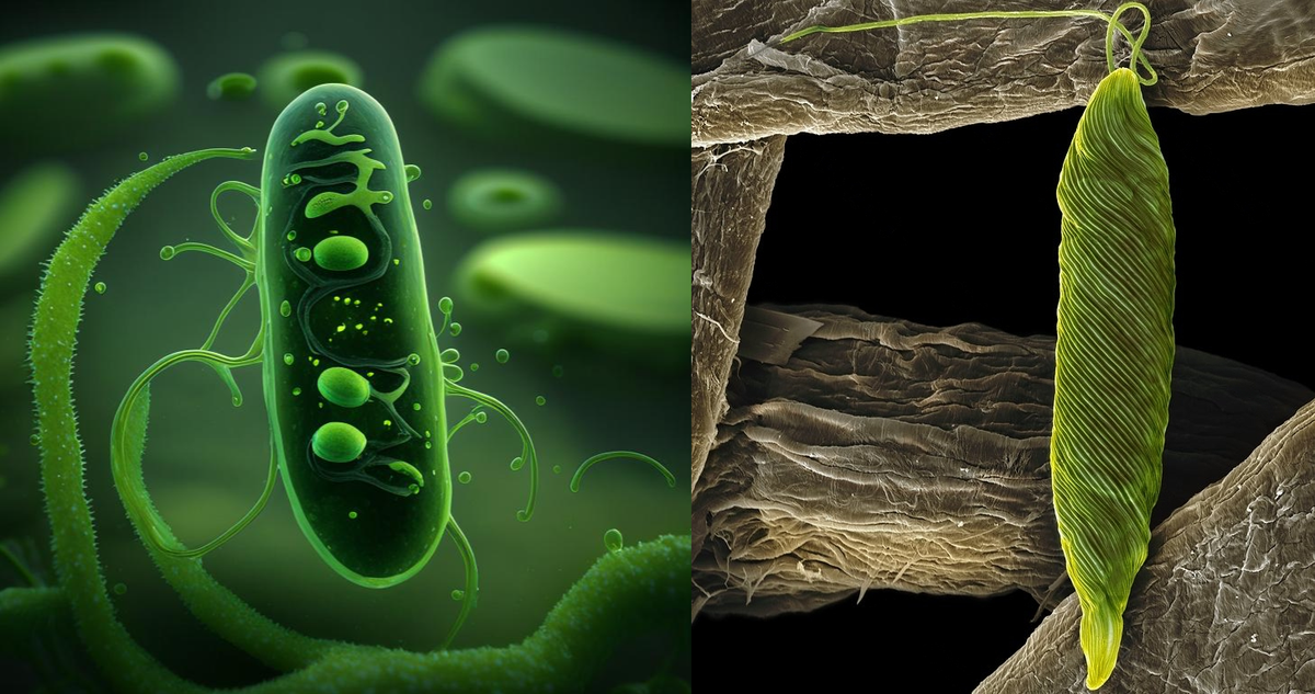 Эвглена в представлении нейросети и реальная фотография (sem). Промт: Эвглена Зелёная. Микроорганизм. Стиль: 3D рендер