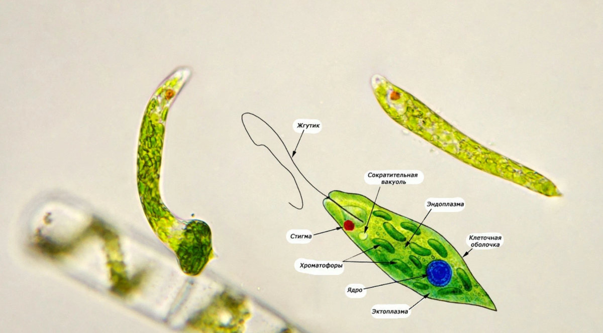 Следующий организм представляет особый интерес, поскольку находится на стыке двух царств, являясь чем-то средним между животным и растением. Эвглена может питаться как за счёт фотосинтеза (у неё есть хлоропласты), так и поедая бактерий и других микроорганизмов.