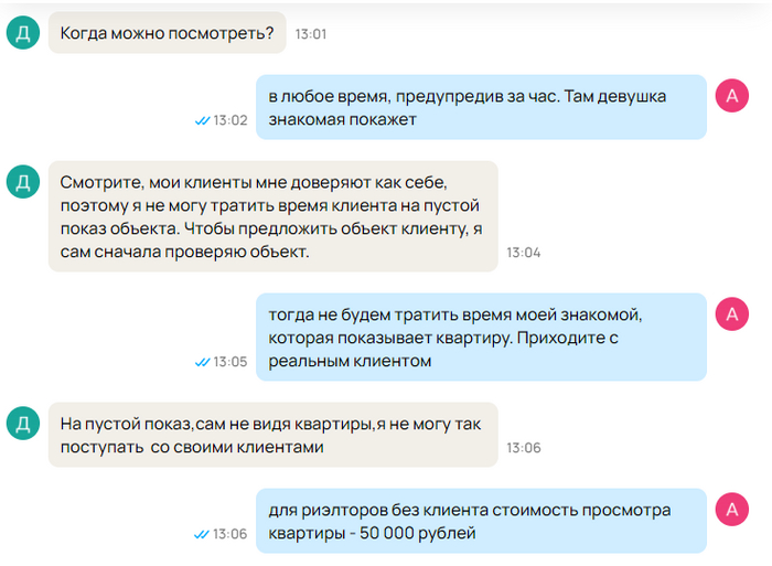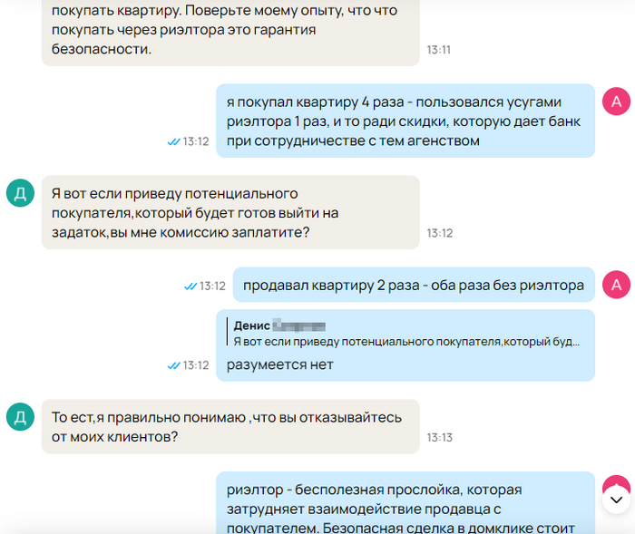 Далее он понимает, что договор с ним заключать я не намерен. Делает последнюю попытку договориться со мной, поиметь хотя бы комиссию за приведенного покупателя.