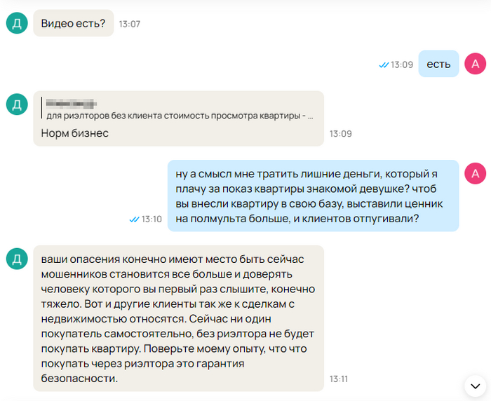 Если бы его интересовало видео, то логично предположить, что он попросил бы его показать. Но его интересует не видео. Он хотел услышать от меня, что видео нет, и тут же предложить свои услуги по продаже моей квартиры, и еще он видео снимет мега-профессиональное на очень крутую камеру, такое, что можно ценник ставить на миллион больше, чем сейчас, и клиенты толпой прибегут.