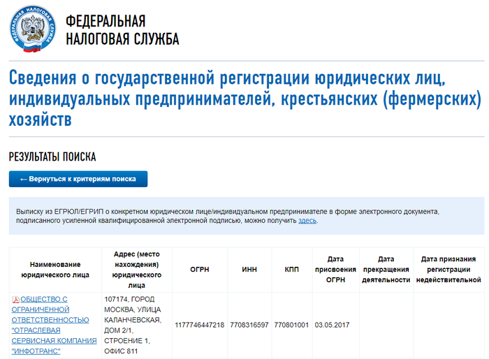 ОАО РЖД в прошлом году 01.09.2017г. делали перевод со своей организации всех РИВЦ (Региональных информационных вычислительных центров) добровольно-принудительно, а это примерно 1500 человек в организацию ООО «ОСК Инфотранс» ИНН 7708316597. Кто не хотел – сокращали. Как вы понимаете просто так всех сократить они не могли и не хотели т.к. это не выгодно, ведь нужно было бы выплачивать полгода з\п и еще выплатить за выслугу лет в РЖД. В ОАО РЖД начали придумывать всякие там байки про то как там будет хорошо в этой новоиспеченной организации ООО «ОСК Инфотранс». Единственный минус был перевода – это потеря всех «плюшек» ОАО РЖД со временем и потеря тех самых денег за выслугу лет, а ведь у кого-то это были не малые суммы по 100-200тыр. Ну да ладно, кто-то ушел по сокращению т.к. не хотели терять эти самые выплаты, а кого-то и уговорили перевестись с повышением мол «будешь у нас в начальниках». Перешло в ОСК «Инфотранс» больше половины — это точно, но это не суть этой статьи. Давайте посмотрим подробней об новоиспеченной организации ООО «ОСК Инфотранс» в которую так агитировали сотрудники ОАО «РЖД». Вся информация есть в свободном доступе на сайте https://egrul.nalog.ru, откуда собственно я и брал её.