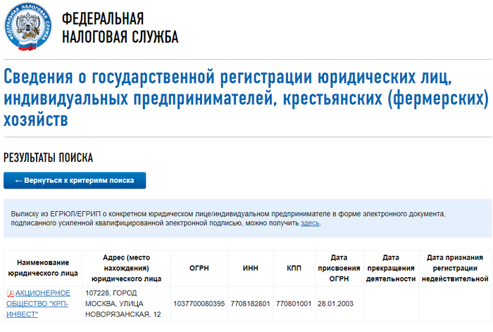 Упс, первый учредитель организации Акционерное общество «КРП-Инвест» ликвидирован 09.08.2004г. Может второй учредитель «жив»?