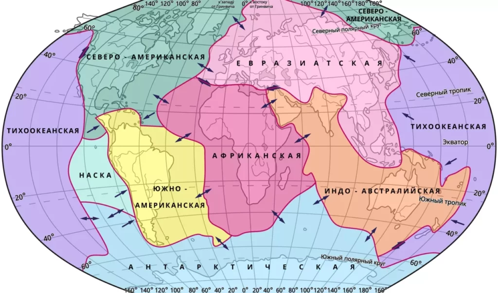 Но в отличие от куриного яйца с монолитной скорлупой, литосфера нашей планеты вовсе не однородна. Мало того, что она разной толщины, так еще и состоит из чешуек. Но это довольно фривольное название, а вот наука называет их литосферными плитами. Почему тогда чешуйки? А потому что плиты располагаются не стык в стык, а наползают одна на другую — примерно так, как рыбья чешуя. Плиты эти не одинаковы по размерам. Современная литосфера делится на 8 крупных и несколько десятков мелких плит.