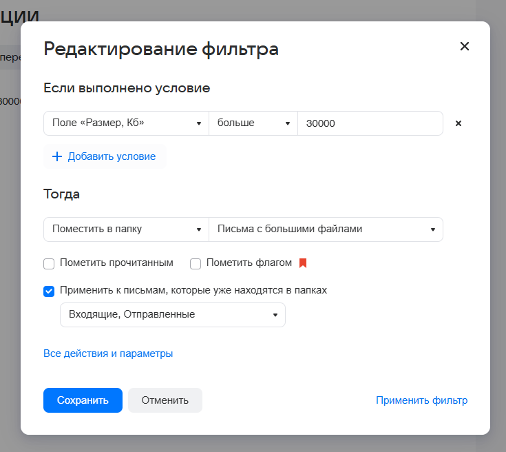 4: Настраиваем фильтр и тут же создаём папку под большие файлы. Добавляем в условиях размер больше 100 мб (не советую ставить маленькое значение изначально, так как в папку могут залететь куча писем с одним-двумя сканами, которые вам возможно нужны, а они запросто могут весить до 10 мб)