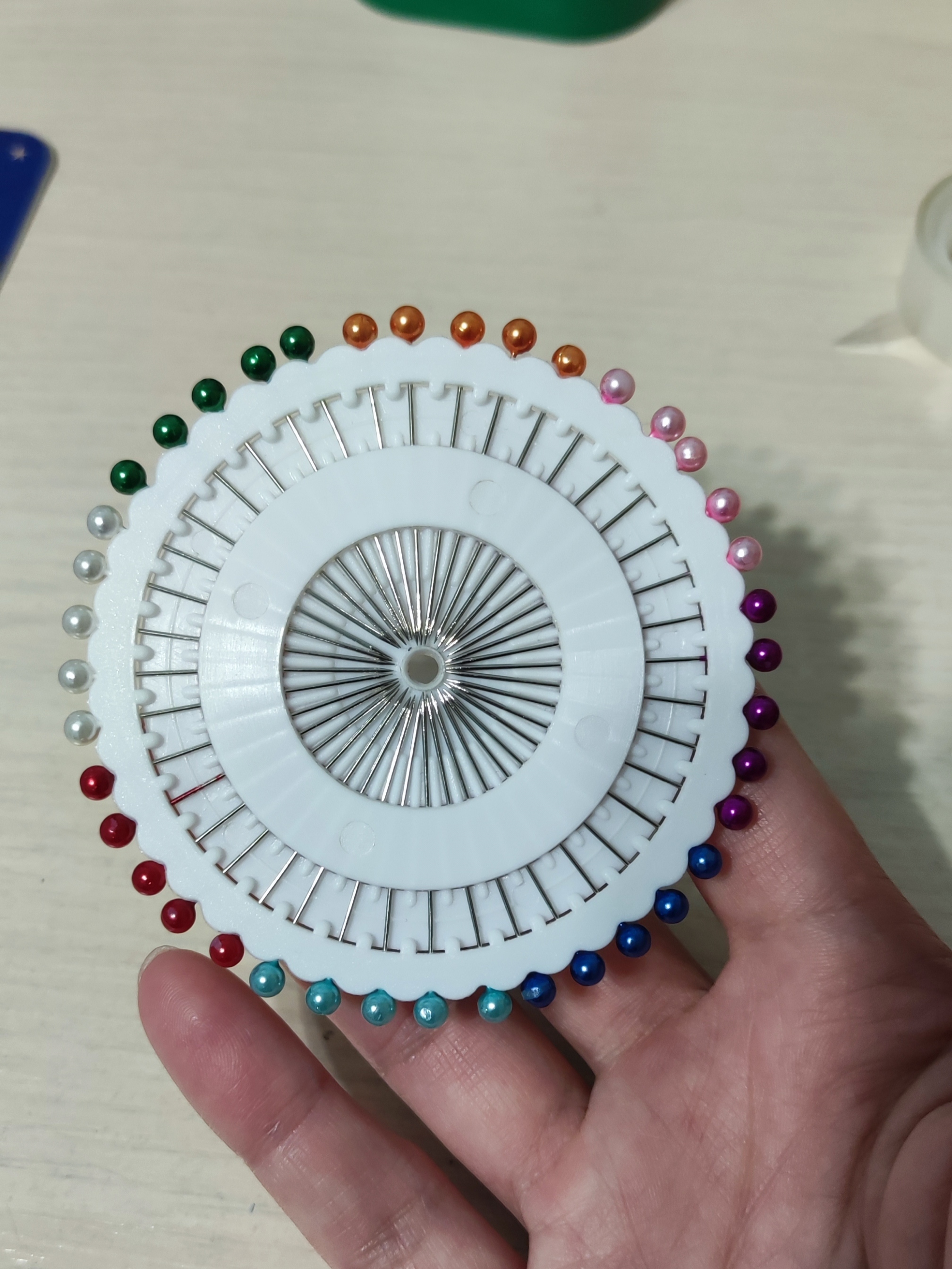 Итак, прошу вашему вниманию - английские булавки. Пользуюсь ими часто (чаще 1 раза в неделю), обычно достаю из этой держалки почти все булавки. А потом раскладываю их обратно по цветам. Люблю порядок)