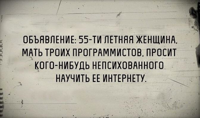 Как бы правда, но есть нюанс... 55-ти летняя женщина как раз застала в молодухах времена появления массового интернета в нашей стране, она сама кого хочешь научит, еще и Винду пиратскую сама накатит. Тем кто настраивал Acorp 56000/56K Fax на домашнем телефоне, запараллеленном с соседями меня поймут. Так что можно смело десяток лет накидывать.