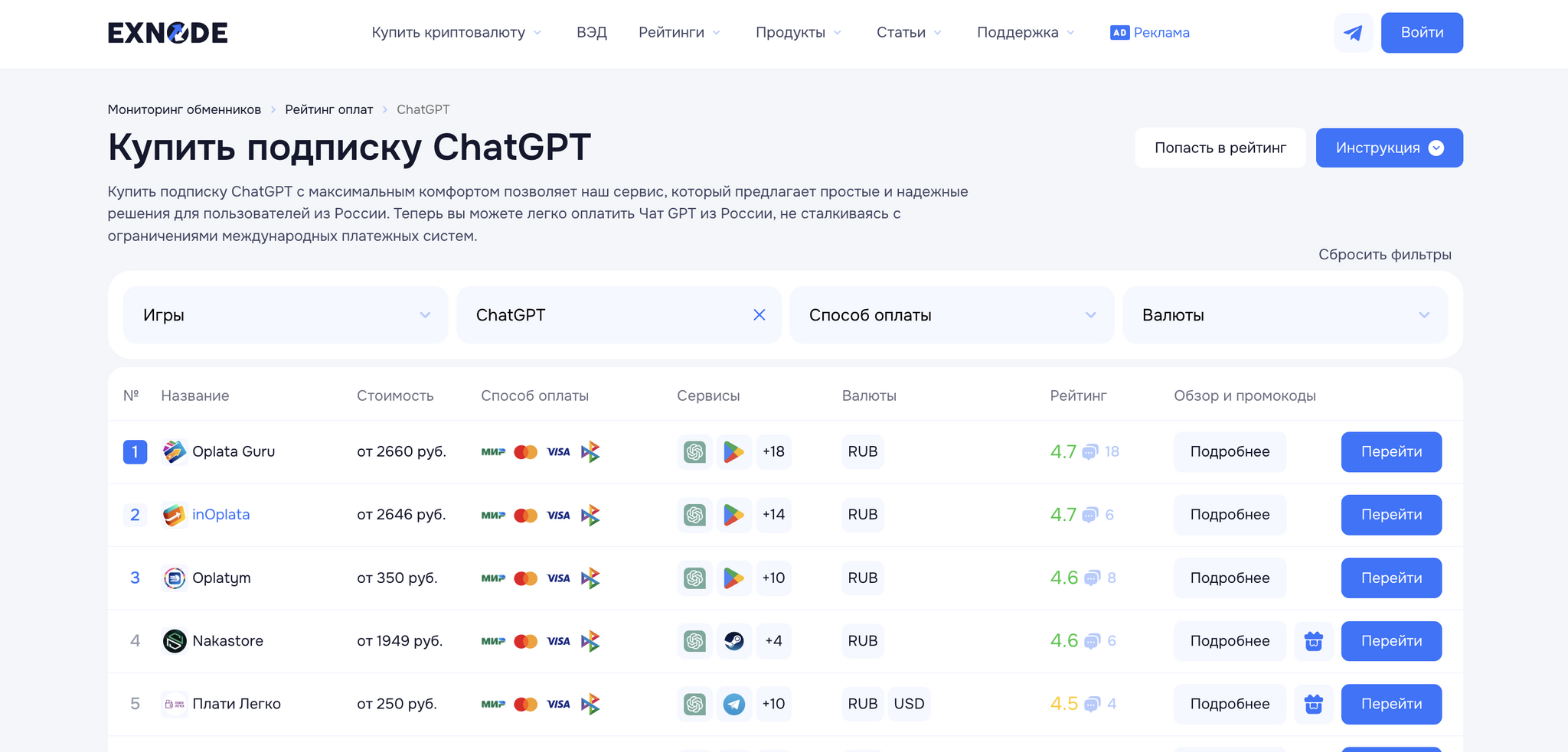 Для начала откройте рейтинг сайтов для оплаты зарубежных сервисов от Exnode. В фильтрах выберите ChatGPT — вам отобразится актуальный список платформ, через которые доступна оплата Чат GPT из России.