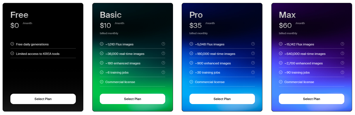 — Max: максимальный план с самыми высокими лимитами и расширенными возможностями. Его выбирают пользователи, для которых Krea — основной рабочий инструмент.
