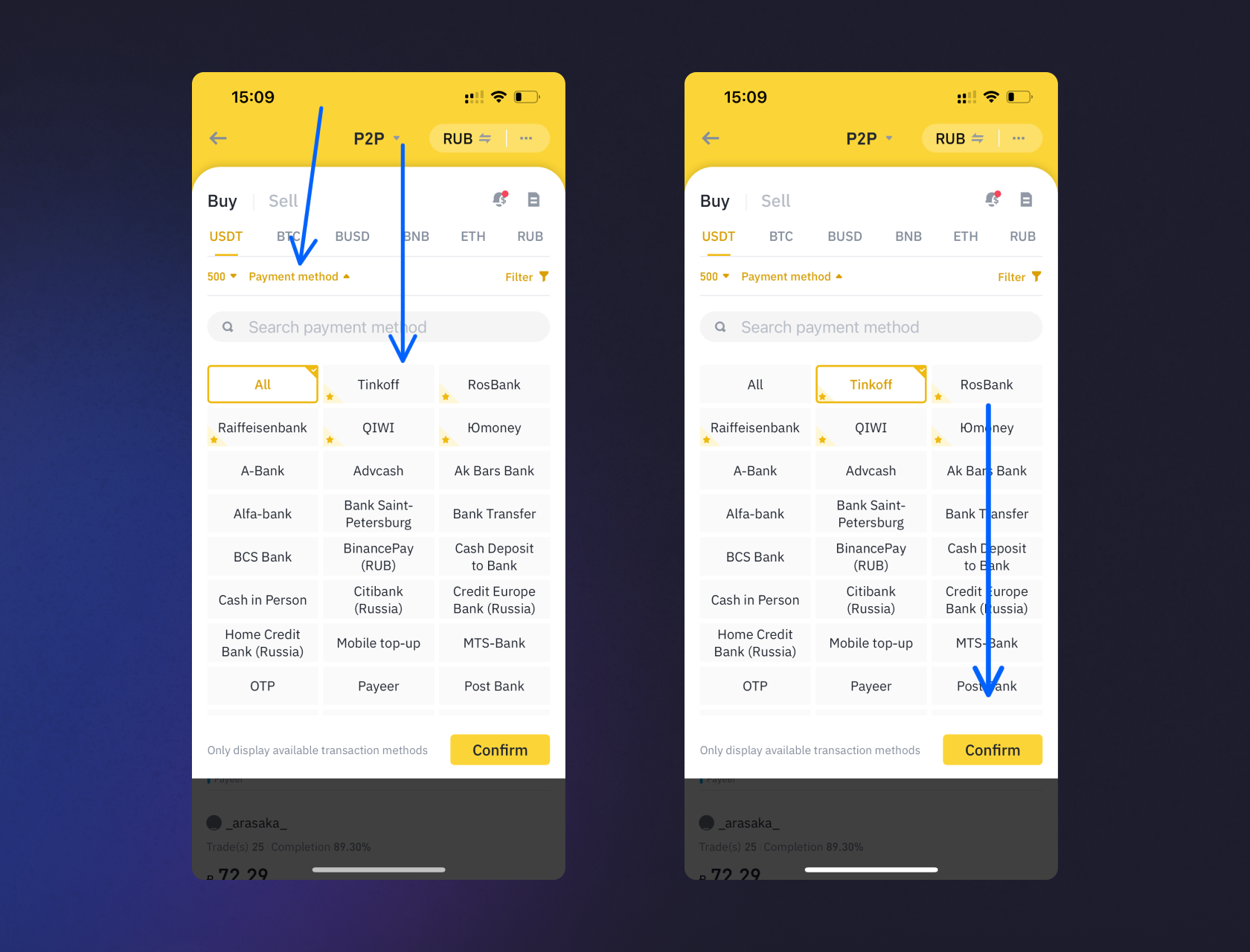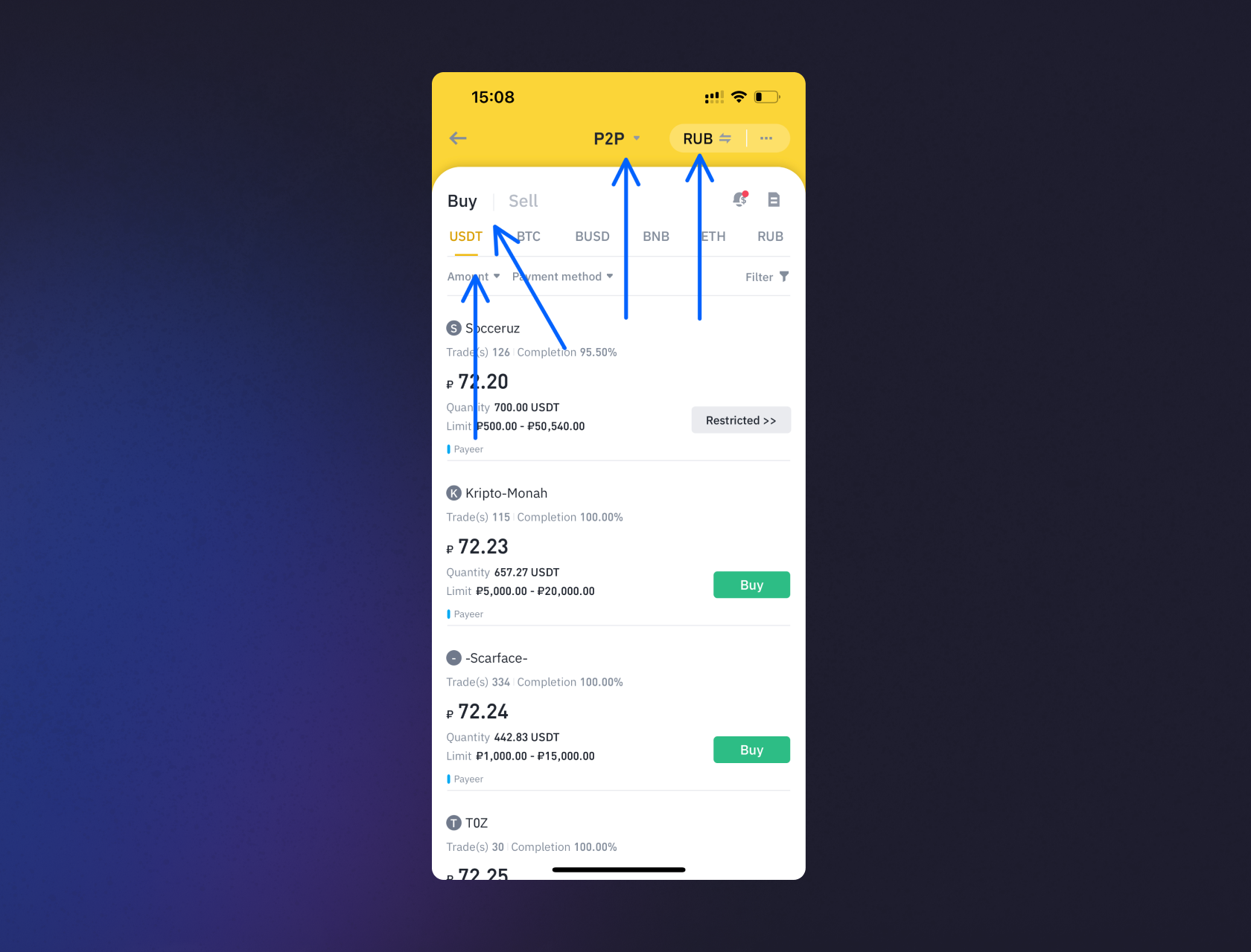 2. При открытии раздела у вас должна быть включена вкладка «Купить» (Buy). В самой верхней частим экрана необходимо выставить переключатель P2P, выбрать валюту RUB. Под переключателем «Купить/Продать» (Buy/Sell) должен быть выбран таб USDT. Сверьтесь со скришотом.