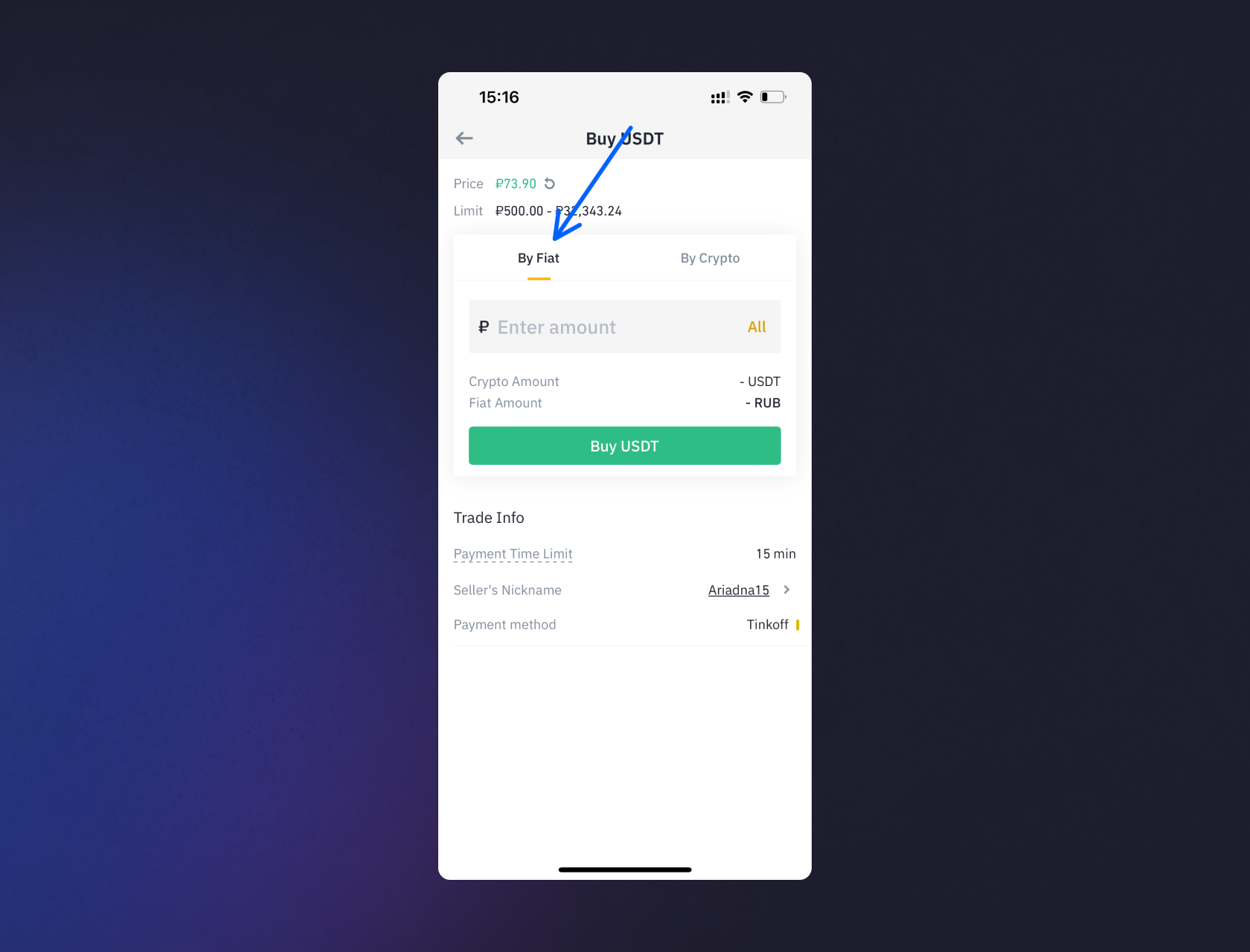 5. Откроется окно покупки USDT, переключатель в верхней части окна «За фиат» (By Fiat) должен быть включен, как на скрине. Далее введите в поле количество рублей, на которые вы хотите купить USDT.