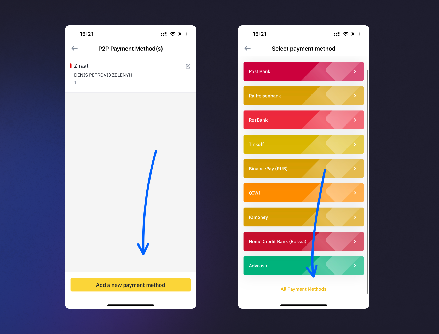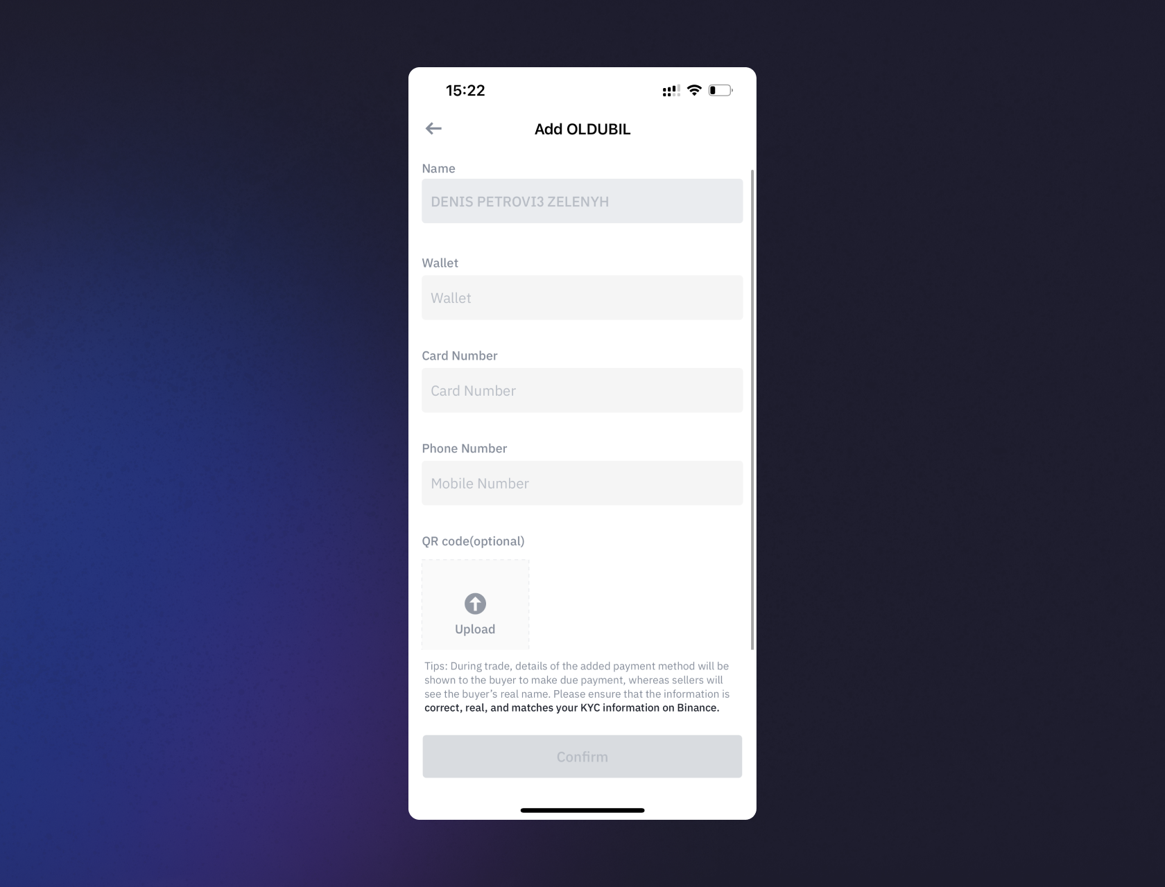 Этап 3. Добавление данных карты OlduBil в Binance