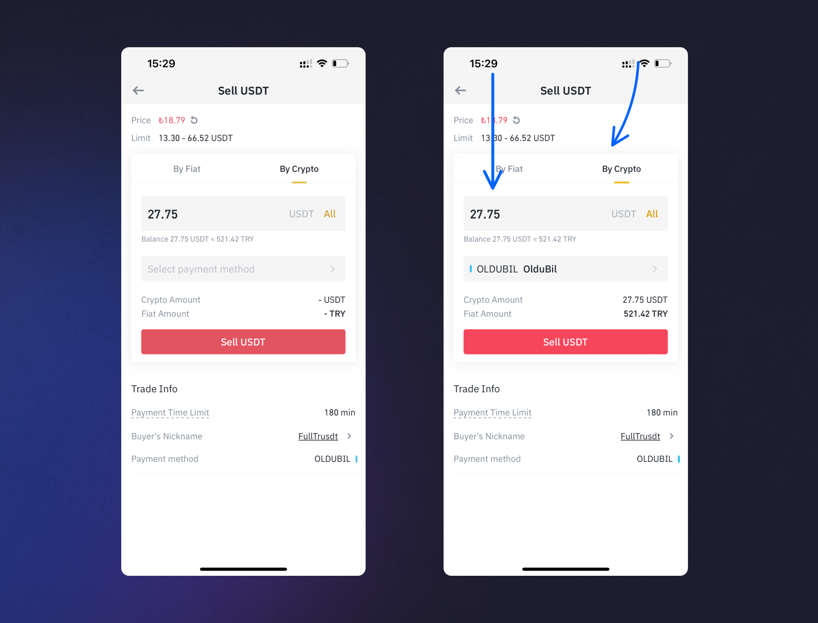 2. Находясь во вкладке «Продать», в верхней части экрана необходимо сменить валюту RUB на TRY.