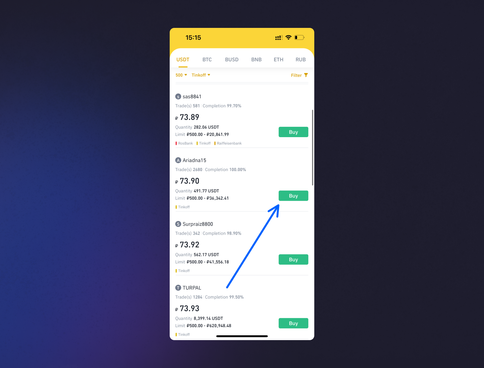 4. После того, как вы выберите свой банк и примените фильтр Бинанс подберет для вас продавцов валют соответствующих выбранным параметрам. В карточках офферов показывается курс по которому будет продан USDT, а также минимальное и максимальное количество валюты, которое можно купить у продавца. Выберите подходящий для вас оффер и нажмите зеленую кнопочку «Купить» (Buy).