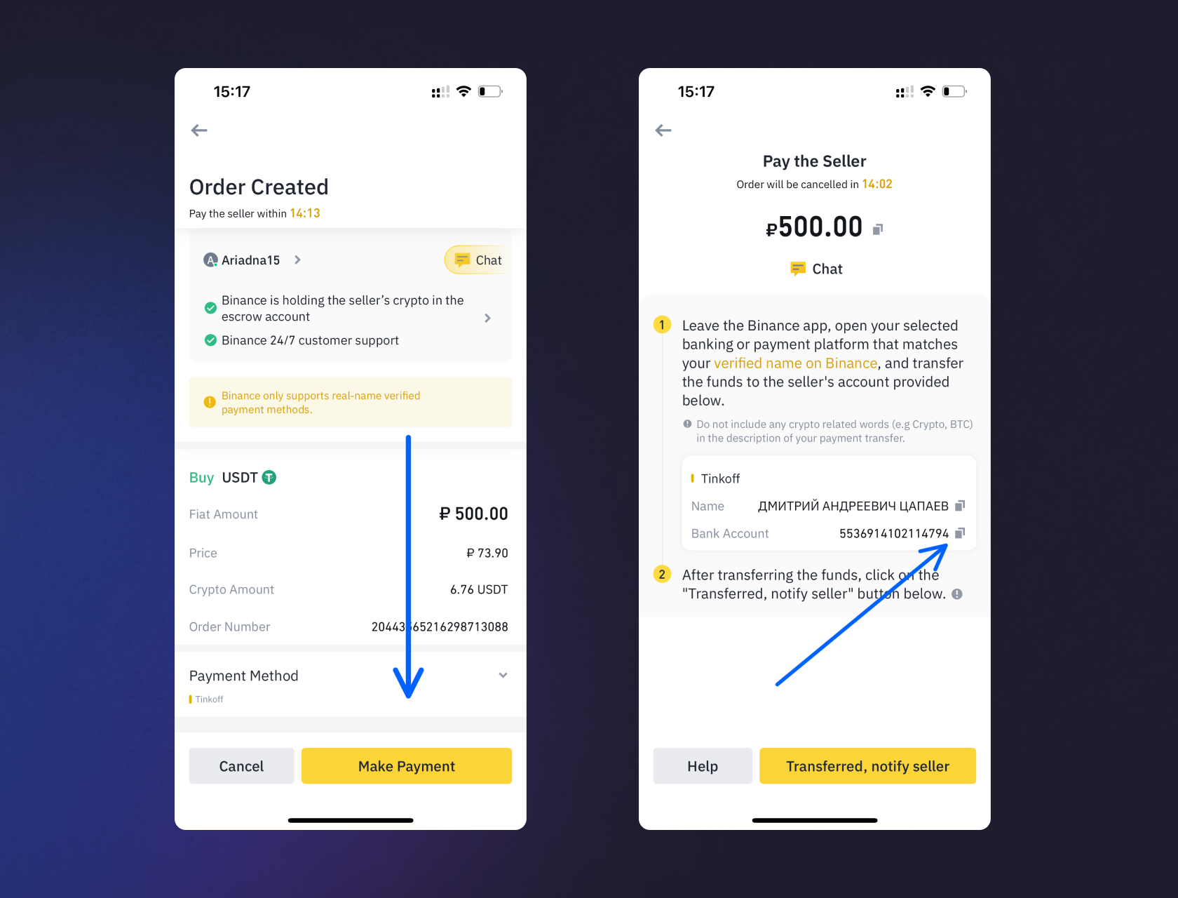 9. Скопировав номер карты необходимо перейти в приложение банка и отправить деньги простым переводом на указанные номер. После чего, необходимо вернуться в Binance и нажать кнопку «Отправлено, уведомить продавьца» (Transfered, notify seller).
