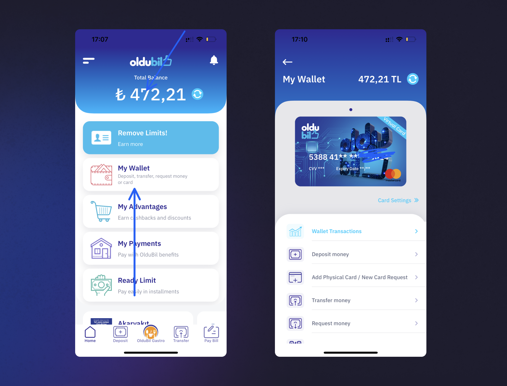 5. Теперь необходимо перейти в приложение OlduBil и нажать на баланс или кнопку «My wallet». Откроется страница карточки.