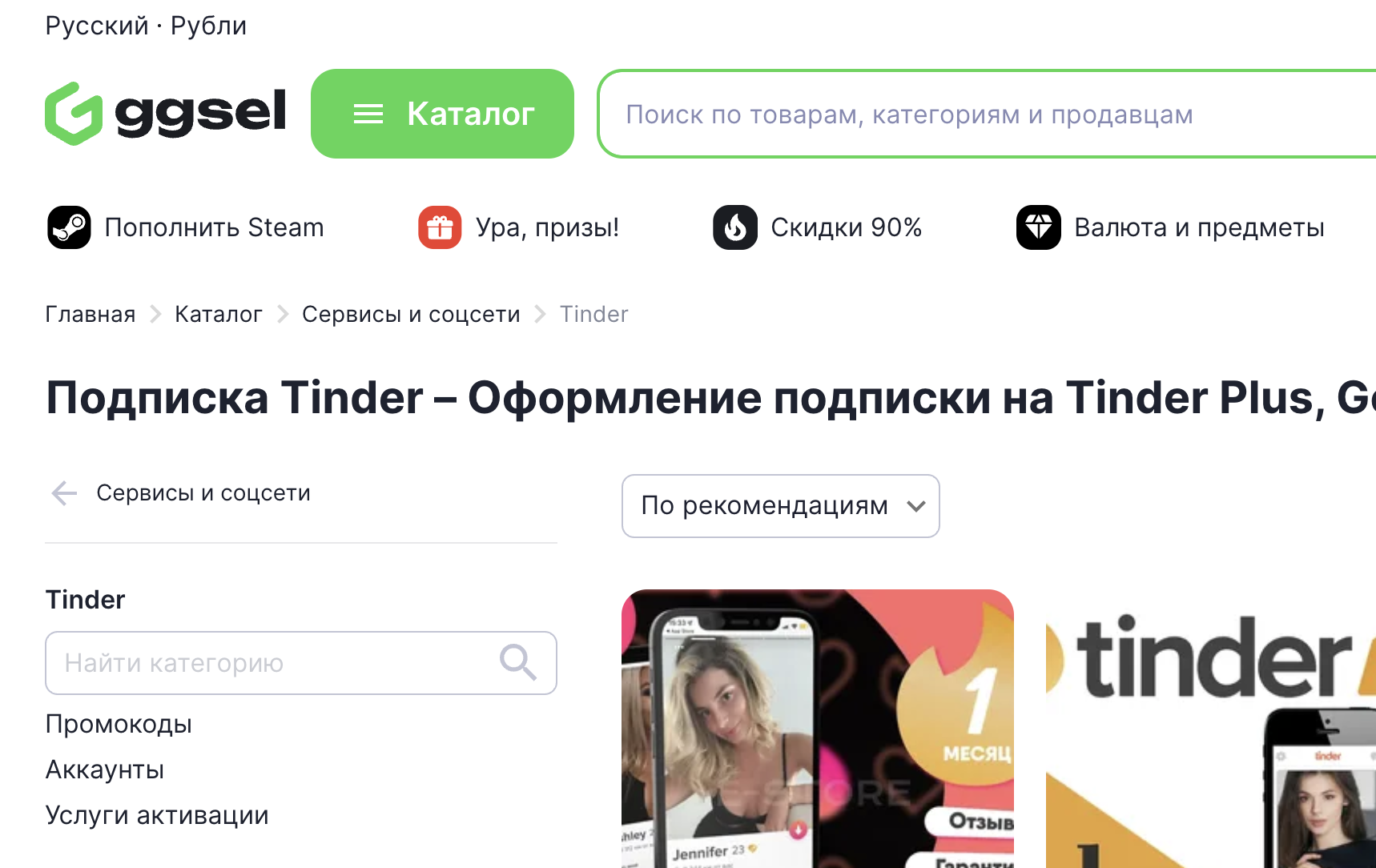 Plati Market предлагает различные варианты подписок на Tinder, включая промокоды и аккаунты с активной подпиской.
