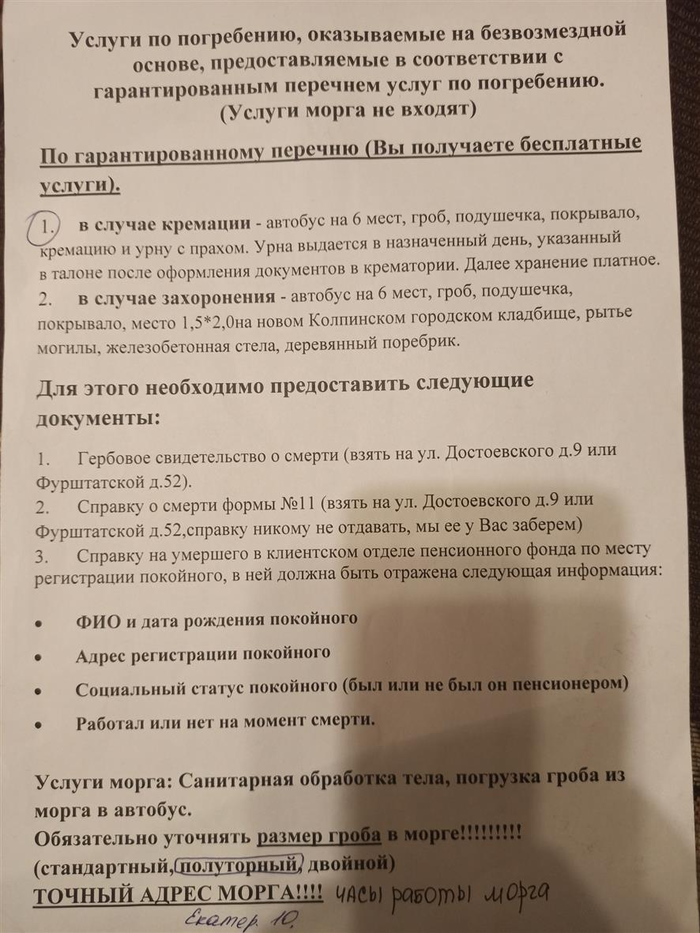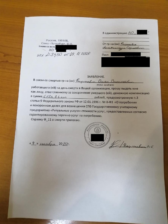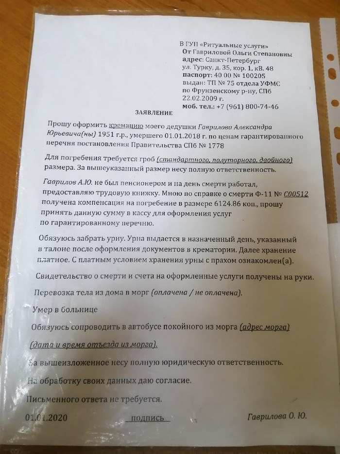 Итак, всë, у вас на руках копия формы 11 и копия завяления (оригиналы оставьте работодателю, он с них компенсирует себе расходы), есть трудовая книжка с последней записью, гербовое свидетельство о смерти и разрешение на похороны/кремацию от СК. Вы молодец, если по гайду получили всë за два дня. Мне понадобилось три. Теперь с этим добром едете в похоронку и пишите там от руки (не спрашивайте — возможно это форма издевательства такая) огромное заявление по образцу. Образец я сфоткал и прилагаю. После чего оплачиваете через кассу деньгу (в С-ПБ принимают карты) и всë.