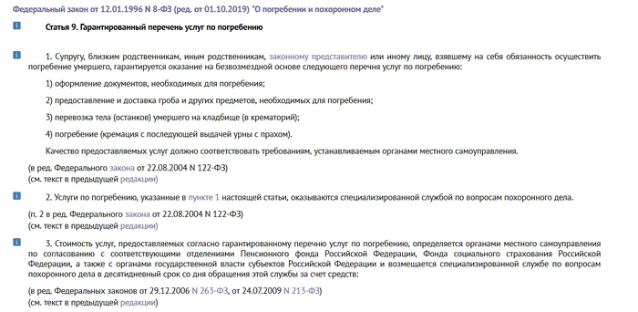 А вот вторым пунктом идет то, что я искал ровно два дня, обзванивая инстанции и напрягая знакомых. Согласно девятой статье вышеприведенного федерального закона человек занимающийся похоронами может безвозмездно получить от государства либо денег из бюджета для возмещение расходов на похороны, либо то что показано на скрине. Но я рекомендую брать услуги из гарантированного перечня. Томушта ритуальщики работают не по рыночным ценам, а безбожно демпингуя. Отчего вы в любом случае, как не крутись, на гроб, машину, кремацию и прочее потратите в разы больше, при этом не факт, что всë будет сделано как надо. Тут же тебе государство организует часть хлопот под ключ, очень удобно.