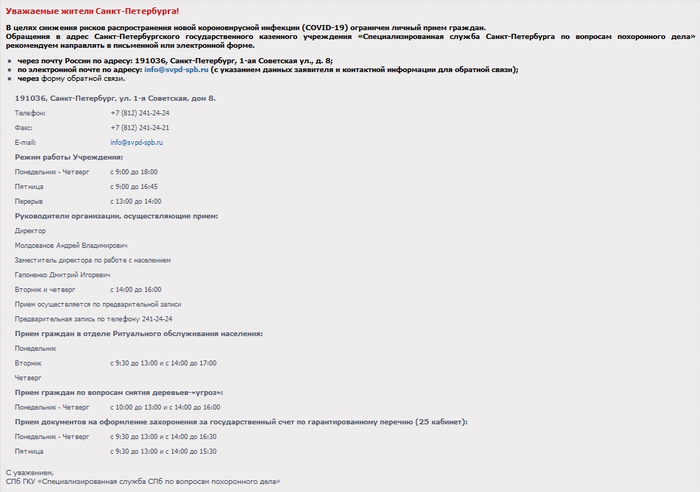 Как я понял, в каждом регионе этим занимаются разные конторы. В Москве это ГБУ «Ритуал», в Питере «Специализированная служба Санкт-Петербурга по вопросам похоронного дела», что в других — мне неведомо. Если есть конкретные наводки, то отпишитесь, добавлю в пост.