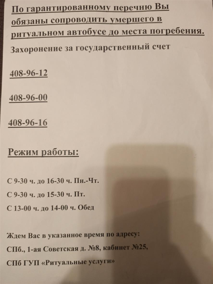 Набираем их по одному из номеров и поясняем ситуацию. «Родственник умер, свидетельство и форма 11 получены, нужны социальные похороны». Это нужно на случай если там чет изменилось. Мало ли они завтра закроются или начнут деревянными членами торговать. Если всë как раньше, то у вас уже есть все нужные квестовые предметы кроме подписанной трудовой книжки (для работающего человека). Но тут нюанс в том, что кроме трудовой вам от работодателя нужно получить бумажку, которую выдадут в похоронке. Поэтому сначала идем на Первую Советскую улицу, дом 8. Там вам сканят все документы и выдают специальную бумажку, которую вы видите на скрине ниже. Согласно этой бумажке, вы на организацию похорон должны стрясти с работодателя шесть косарей и притащить их в похоронку. Поэтому самое время двигать на место работы усопшего.