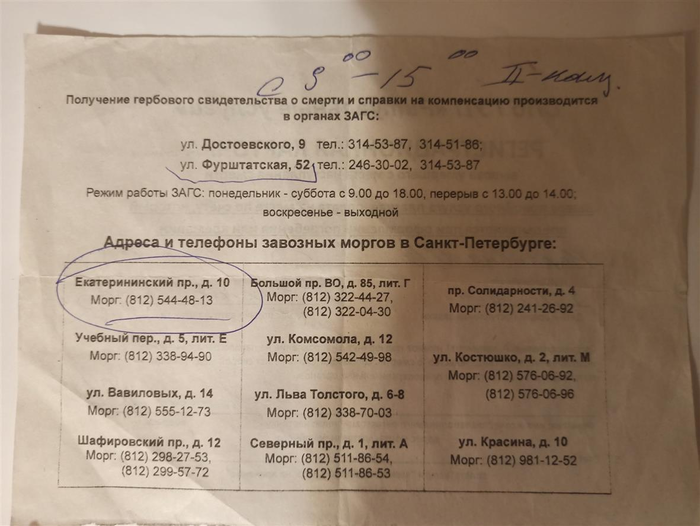Доброе утро, вы всë ещë в ахуе и хотите выть в подушку, но не время киснуть, пора в морг. Вчера вам выдали квиток, посмотрите на него внимательно. Там обычно указан ваш морг и ваш ЗАГС, как у меня на скрине.