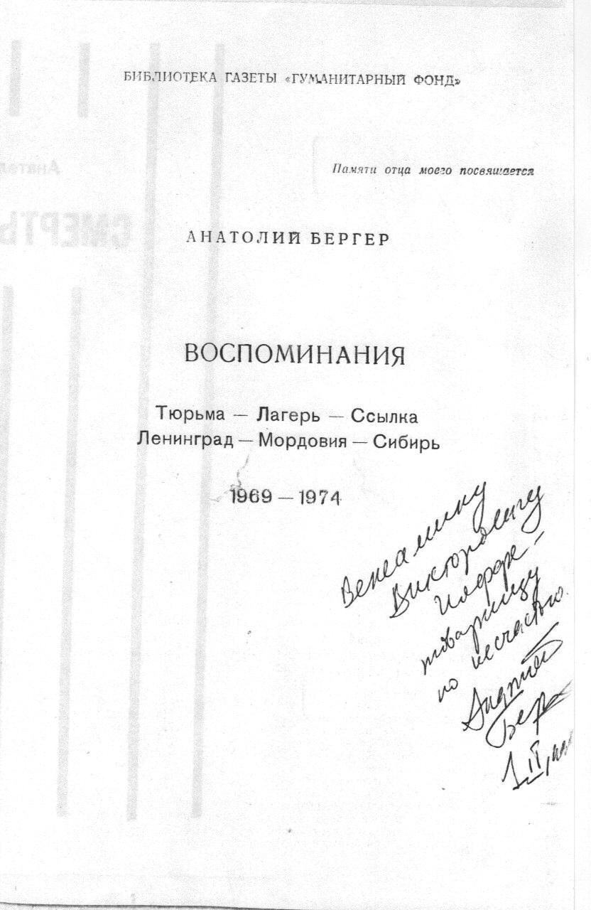 Бергер А. Смерть живьем. Воспоминания: Тюрьма - Лагерь - Ссылка. Ленинград - Мордовия - Сибирь, 1969-1974/Всесоюзный гуманитарный фонд им. А. С. Пушкина, г. Москва, 1991 год.