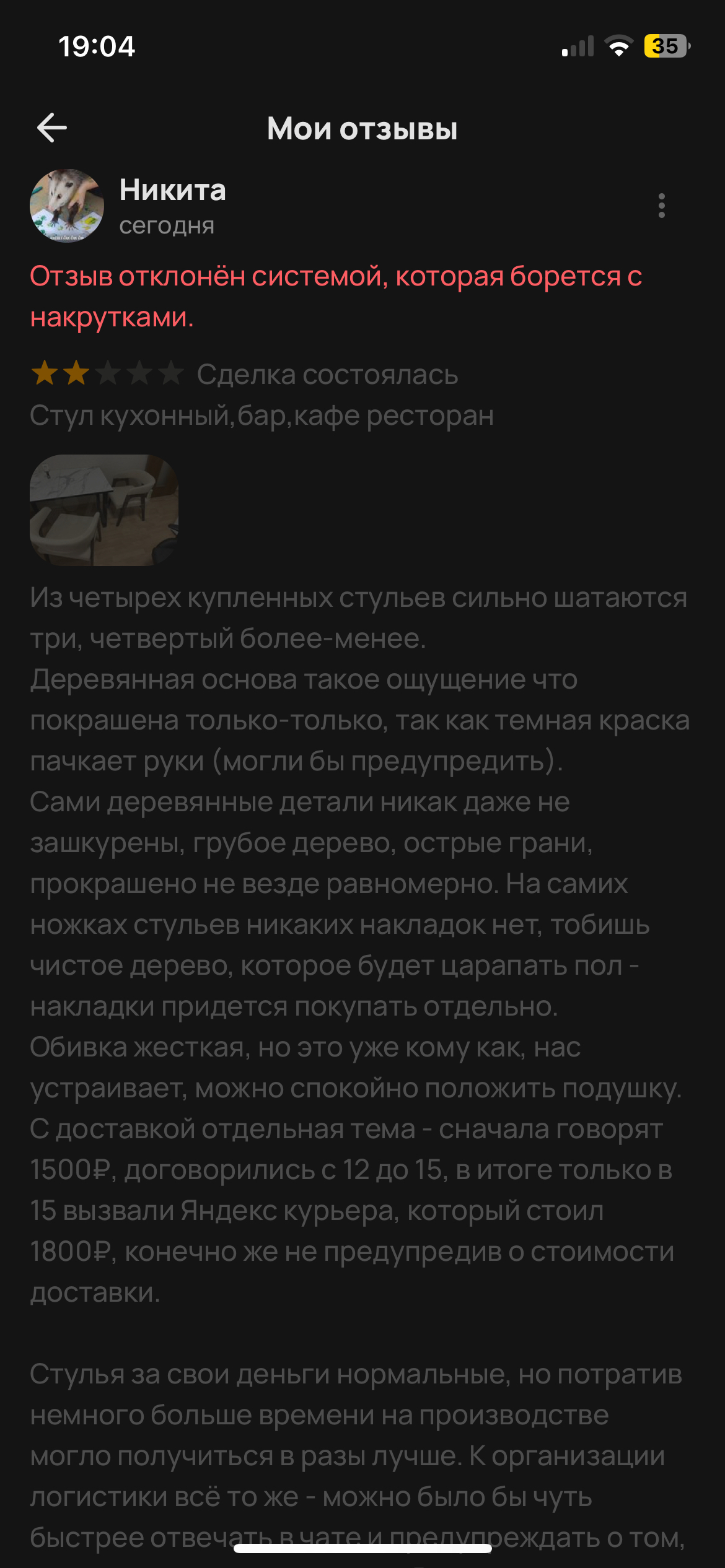 Купил на Авито стулья. Новые, от производителя, привезли, все ок. Но сами стулья и логистика мягко говоря не понравились - решил отзыв оставить, расписал все с максимальными подробностями, через пару часов захожу посмотреть что там с ним: