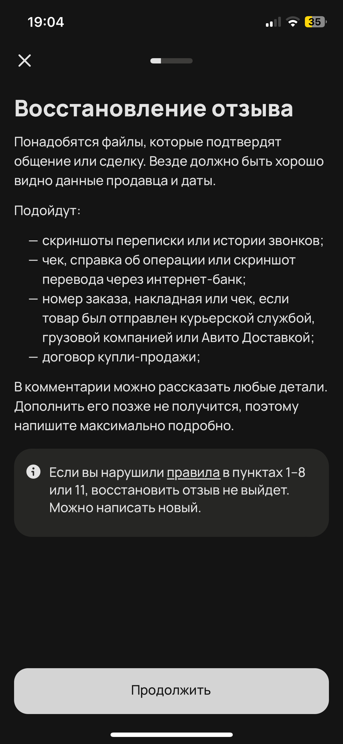 Вишенка на торте - для публикации отзыва хотят увидеть скриншоты переписки итд. Авито, вы ёбнулись в край? Я понимаю конфиденциальность вся фигня, но вы буквально просите отправить вам скриншоты переписки на ВАШЕМ сайте. У вас люди просто так работают, что не могут сами зайти и хотя бы посмотреть была ли переписка одного аккаунта с другим и какая у неё продолжительность дабы понять накручен ли отзыв?