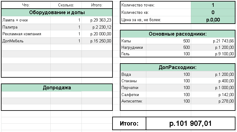 ДопМебель и допрасходники, вы сможете купить по месту. Итого примерно - 102к, тут уже всё зависит от курса доллара и стоимости расходников у перекупов.