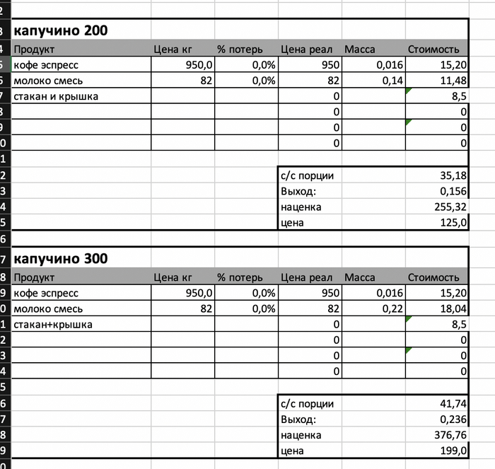 К этой табличке у меня привязывается еще два листа - расчет себестоимости и наценки. Наценку считаю по основным позициям - молочные напитки.