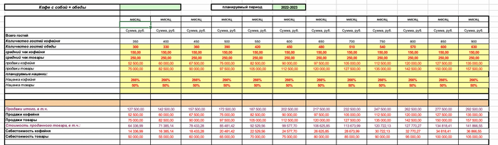 Основная часть расчетов - табличка "расчет". В ней - средние цены, количество клиентов, плановая наценка и вытекающие из этого суммы выручки и себестоимости продуктов.