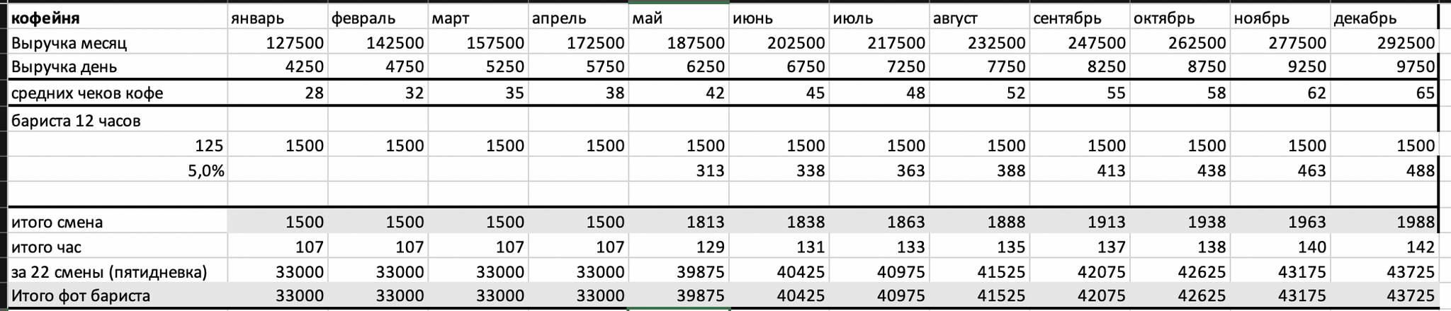 Параллельно мы получаем прогноз количества клиентов, исходя из которого можем посчитать ФОТ. В моем случае - работа пятидневкой, поэтому мне достаточно 1 бариста, который бы работал постоянно. На случай форс-мажоров всегда есть я.