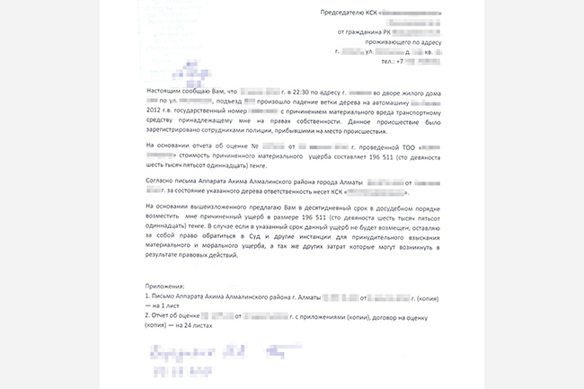 В неприятную ситуацию пару лет назад попал наш коллега Игорь. В одном из алматинских дворов на его Kia Cerato упала толстенная ветка — вмятина на крыше, разбитое заднее стекло и там-сям по мелочи. Ущерб, как показала экспертиза, на 196 511 тенге или 39302 рубля (курс 1 рубль-5 тенге). Игорь навёл справки и попробовал взыскать деньги с КСК (ЖКХ), на территории которого произошла неприятность. Его предложение о мирном урегулировании вопроса проигнорировали. Тогда потерпевший обратился в суд и потребовал уплатить ему 203 511 тенге (40702 р) — счёт за ремонт авто и услуги оценщиков. Плюс судебные расходы — 20 351 тенге (4000 р)(10 % от суммы иска). Суд требование Игоря поддержал и обязал КСК покрыть ущерб.