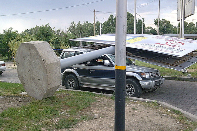 Похожий алгоритм действий ждёт автовладельцев и в случае, если из-за ветра на машину упала не ветка, а, к примеру, рекламная конструкция. Единственное отличие — ответчика придётся искать с помощью запросов в подразделении местного акимата, ведающем рекламой.