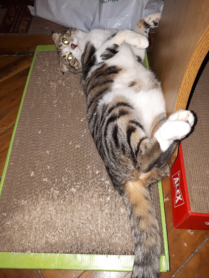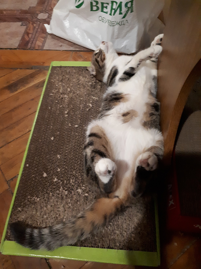 В один чудесный день, когда стерилизация не состоялась в силу отказа анестезиолога после результатов узи сердца, я разговорилась с нашим лечащим врачом и посетовала на её тягу к заточке когтей. Доктор посоветовал нам купить дешевую когтеточку из гофрированного картона, коей в клинике не оказалось. "А, нет, смотрите - осталась последняя!"