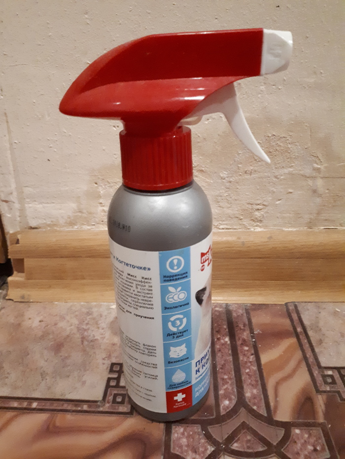 Какой-то добрый человек посоветовал мне воспользоваться спреем для приучения к когтеточке, но не предупредил (скорее всего потому что сам не знал) о том, что эти спреи расчитаны на стерилизованных животных. Для тех, кто не следит за судьбой моей мадам: ей запрещен любой наркоз в силу генетических нарушений, поэтому мы 3 раза в год делаем укол от "ламбады". Но об этом средстве я узнала позже, а тогда я сразу же купила первый попавшийся спрей для приучения к когтеточке