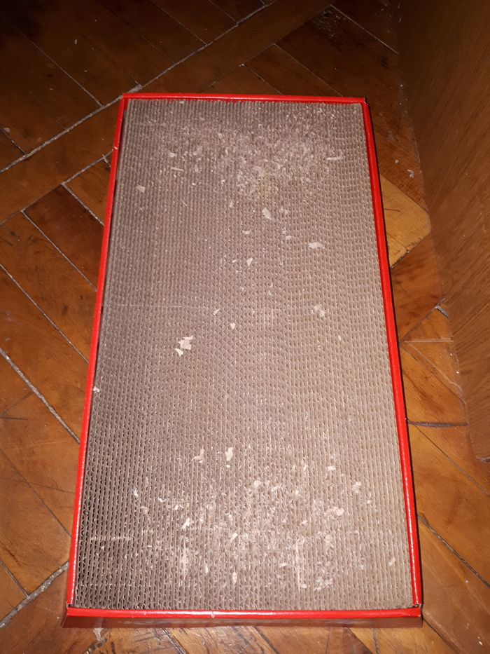 В наборе под пленкой нашелся пакетик с кошачьей мятой, которой, по инструкции, надо было посыпать когтеточку, чтобы больше привлечь кошку. Типа, она будет пытаться достать мяту из щелей и начнет точить когти. Наша первая удачная когтеточка выглядела так: