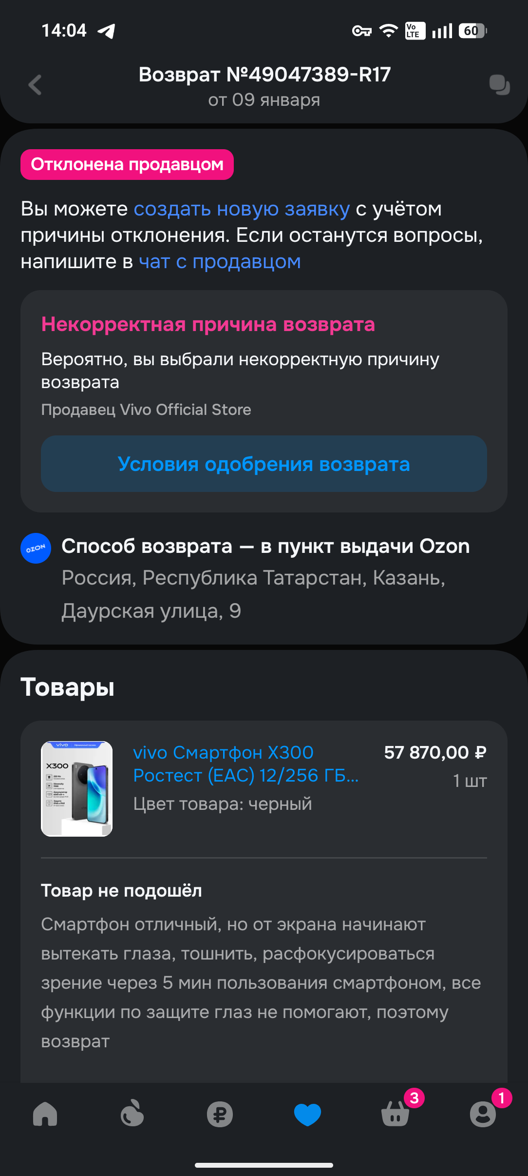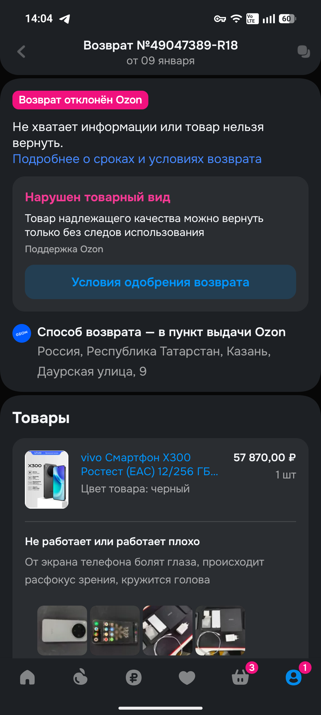 Окей, оформил возврат второй раз, снова отказ. Открыл спор - Озон в ту же секунду оформляет отказ в споре, потому что "НАРУШЕН ТОВАРНЫЙ ВИД". Что за цирк с конями?