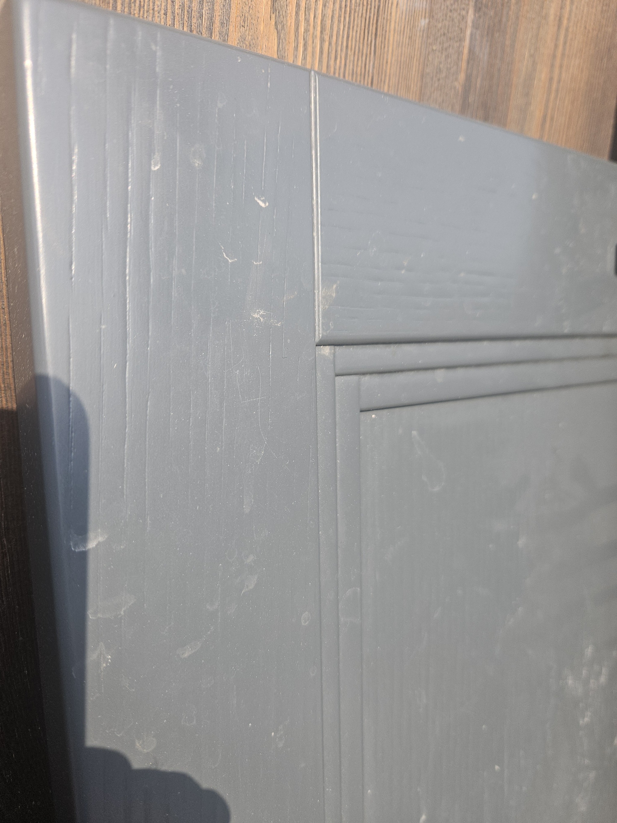 Купили квартиру в ипотеку, сделали косметический ремонт, и хотим перекрасить фасады кухни, т.к. темно-серый цвет кухни подходит) Фасады похожи на шпон под эмалью, на мой взгляд.