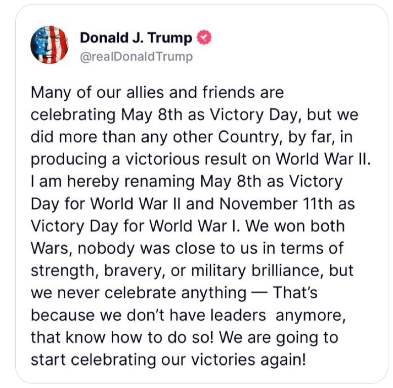 Многие наши союзники и друзья отмечают 8 мая как День Победы, но именно мы сделали для победы во Второй мировой войне больше, чем любая другая страна - несравнимо больше. Сегодня я объявляю 8 мая Днем Победы во Второй мировой войне, а 11 ноября - Днем Победы в Первой мировой. Мы победили в обеих войнах, никто даже не приблизился к нам по силе, храбрости и военному мастерству, но мы больше ничего не празднуем - потому что у нас больше нет лидеров, которые умеют это делать! Пришло время снова начать праздновать наши победы!