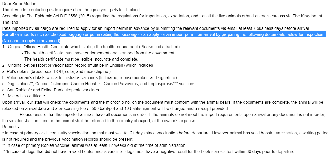 Как я понимаю, из-за большого наплыва людей с питомцами, сотрудники вет. службы Бангкока перестали справляться с количеством заявок на выдачу разрешений и начали отвечать людям, что разрешение будет выдано по прилёту или просто игнорировали письма (как было в моём случае).