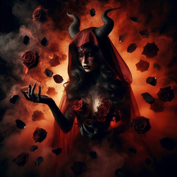 демонесса, облаченная в плащ из огня, окутанная мрачным туманом из лепестков черной розы, в динамичной позе