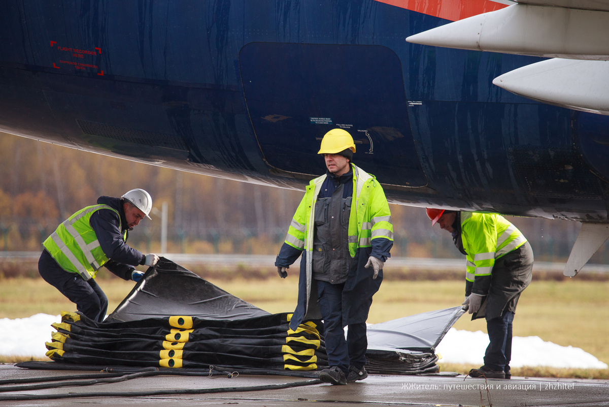 Сразу предупрежу: не пугайтесь. В аэропорту Домодедово проходят учения, самолет тренировочный, никто не пострадал. И как раз для того, чтобы никто не пострадал в случае чрезвычайной ситуации или для того, чтобы пострадавших было меньше, как раз и проводятся учения. Про них я обязательно расскажу, но сейчас о том, как поднять самолет. Происходит это на самом последнем этапе, после того, как отработали пожарные, спасатели, медики и другие службы.