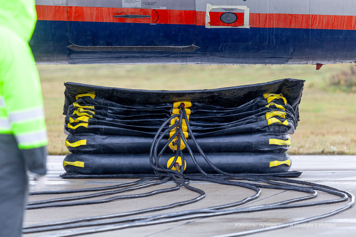Под фюзеляжем около передней стойки и в задней части укладывают друг на друга пневмоподушки. Официально это называется аварийный пневмотканевый подъемник.