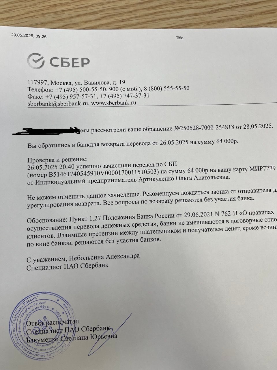 Сегодня получили ответ в устной форме(по телефону) от банка, что у Сбербанка лапки и он ничего делать не может, так как перевод был осуществлен через СБП. Очень странная позиция если честно.