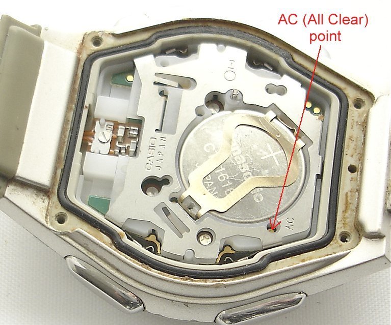Снимаем крышку, если на корпусе часов под крышкой есть грязь, убираем её булавкой и грушей, щёткой для этого лучше не пользоваться, т.к. при этом грязь скорее всего попадёт внутрь часов. Убираем пластиковую вкладку пинцетом, под ней находится батарейка.
