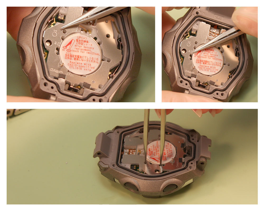Далее идём с батарейкой в магазин и покупаем аналогичную. Важно купить точно такую же батарейку, отличаться может только производитель (лучше покупать батарейки нормальных производителей - Maxell, Sony, Toshiba, Panasonic и т.д.), если вы купите батарейку другой модели (даже если они внешне похожи), размер может немного отличаться и установив её вы можете повредить механизм часов. Вставляем новую батарейку на место (удобнее вставлять батарейку, двигая её в сторону защёлки, так для установки вам не понадобится дополнительный инструмент и меньше шанс что-нибудь погнуть или сломать) и собираем всё в обратном порядке. Проверьте, на месте ли уплотнительная резинка, если она сместилась, верните её на место. В официальных сервисах при замене батарейки могут поменять и резинку, но у вас всё равно скорее всего нет запасной, поэтому просто проверьте её на целостность.