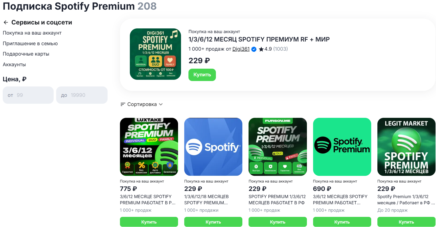 Здесь можно приобрести прямую покупку Spotify Premium на ваш аккаунт, более бюджетное приглашению в семью, подарочные карты для самостоятельной активации подписки на определенный срок, а также готовый аккаунт в другой стране — пустой или с оформленным Premium.